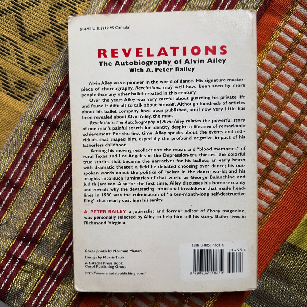 1997 Softcover printing of "Revelations, The Autobiography of Alvin Ailey”. Wear and yellowing of pages consistent with age and use in very good pre-loved condition. Minimal to no lines, notes or marks within text.