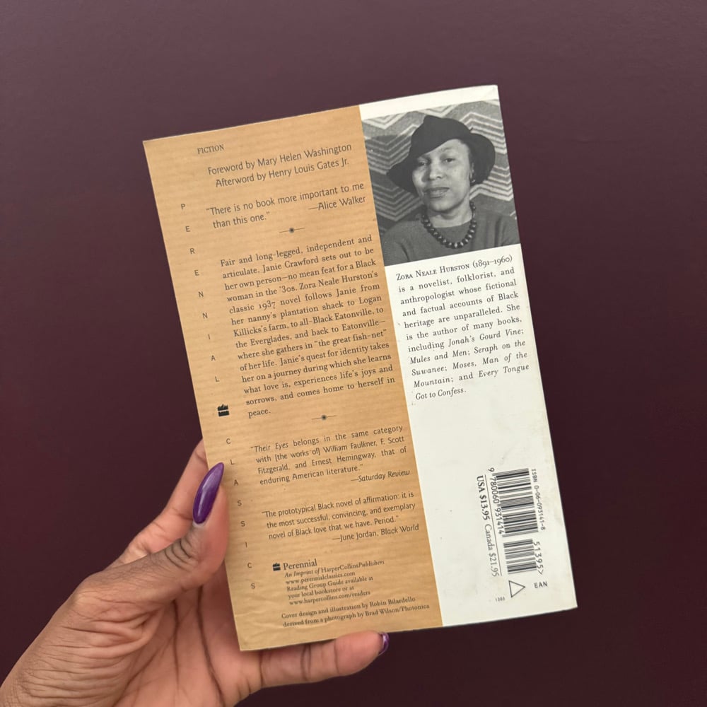 Modern softcover printing of "Their Eyes Were Watching God” by Zora Neale Hurston. Wear and yellowing of pages consistent with age and use. In very good pre-loved condition. No lines, notes or marks within text.